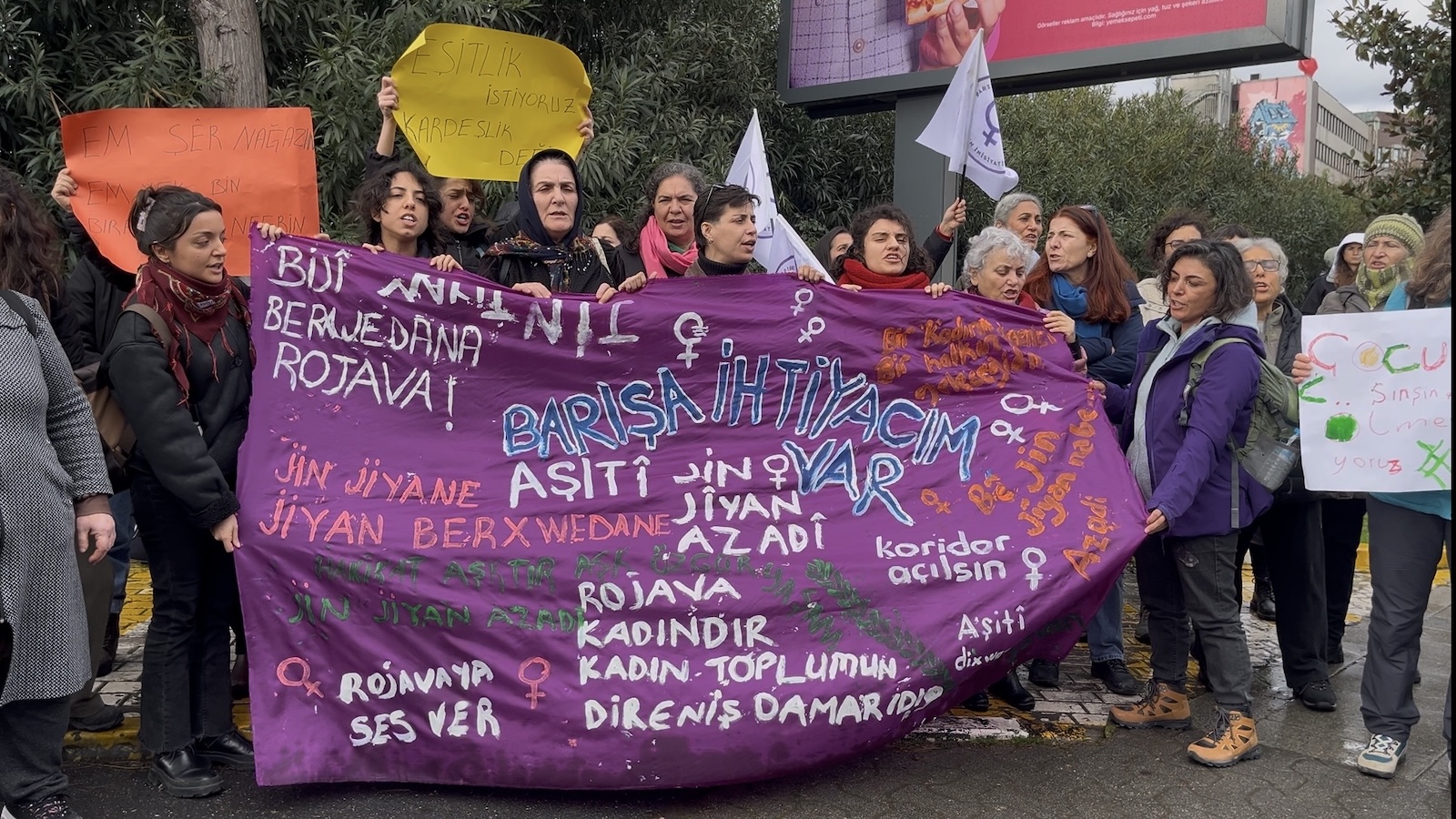 Kadınlar, “HTŞ çetelerine destek Suriye’de katliam demek, kadınlar direnen Kürt halkının yanında” pankartı açtı. Eylem boyunca “Jin, jiyan, azadî”, “Rojavalı kadınlar yalnız değildir”, “Kadınların bedeni savaş meydanı değildir”, “Barış için ısrar ediyoruz” ve “Yaşasın kadın dayanışması” sloganları atıldı.